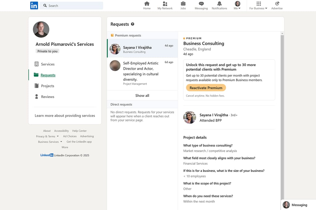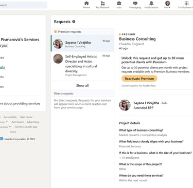 "Premium requests are project requests that are available to you with a Business Premium subscription. Direct requests are project requests from members who have submitted a request directly through your service page. You will be notified when you receive a new project request. They will appear here when a client reaches out from your service page."